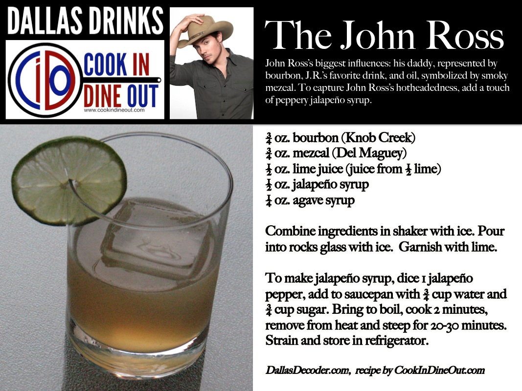 This summer, the “Dallas” fans at Dallas Decoder and Cook In/Dine Out are offering “Dallas Drinks,” a series of cocktails inspired by the characters from TNT’s new series. First up: The John Ross, a drink as fiery as Josh Henderson’s performance.