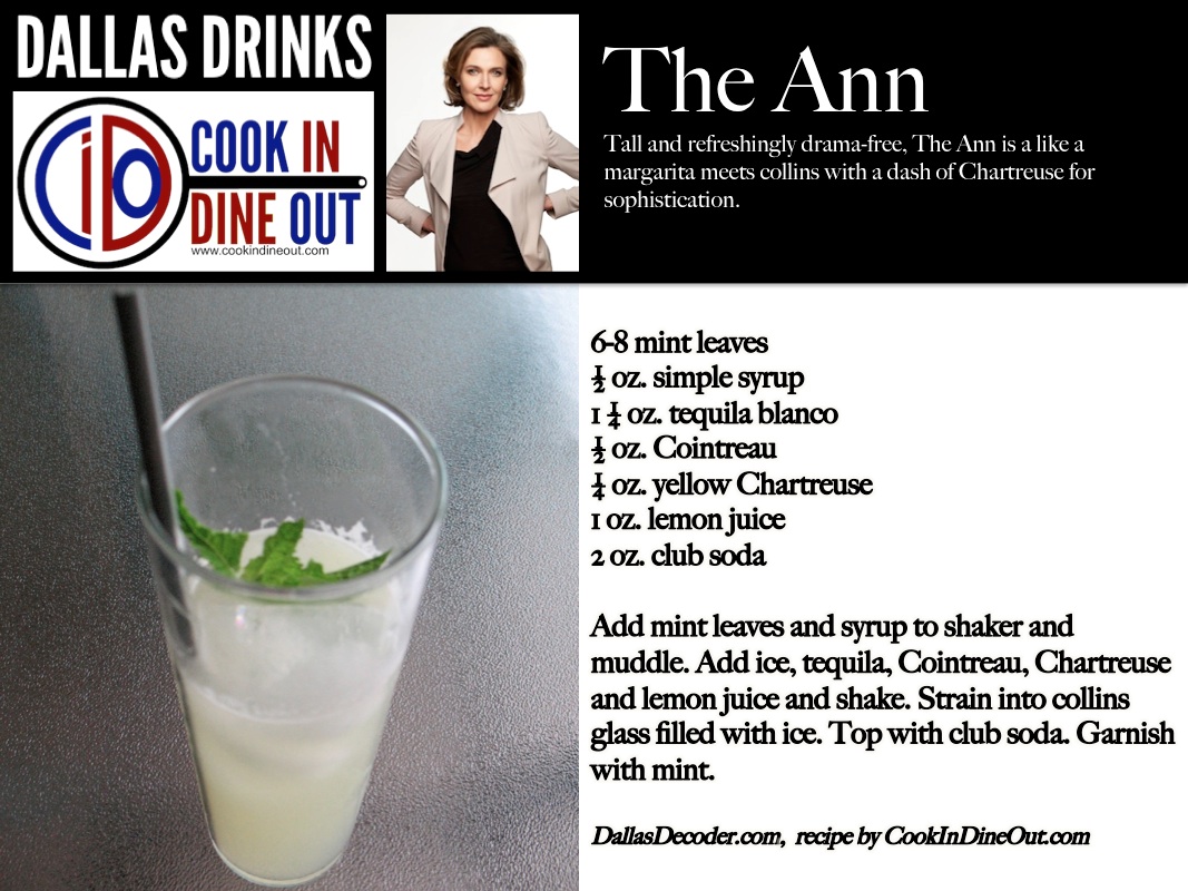 This summer, the “Dallas” fans at Dallas Decoder and Cook In/Dine Out are offering “Dallas Drinks,” a series of cocktails inspired by the characters from TNT’s new series. This week: The Ann, a drink as classy as Brenda Strong.