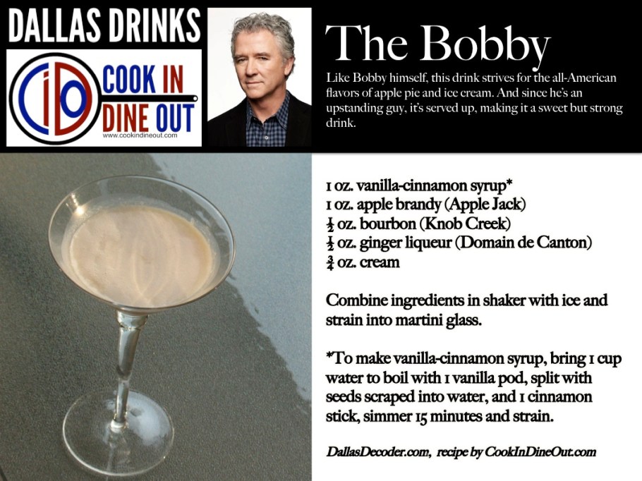 This summer, the “Dallas” fans at Dallas Decoder and Cook In/Dine Out are offering “Dallas Drinks,” a series of cocktails inspired by the characters from TNT’s new series. This week: The Bobby, a drink that’s as all-American as Patrick Duffy’s classic character.