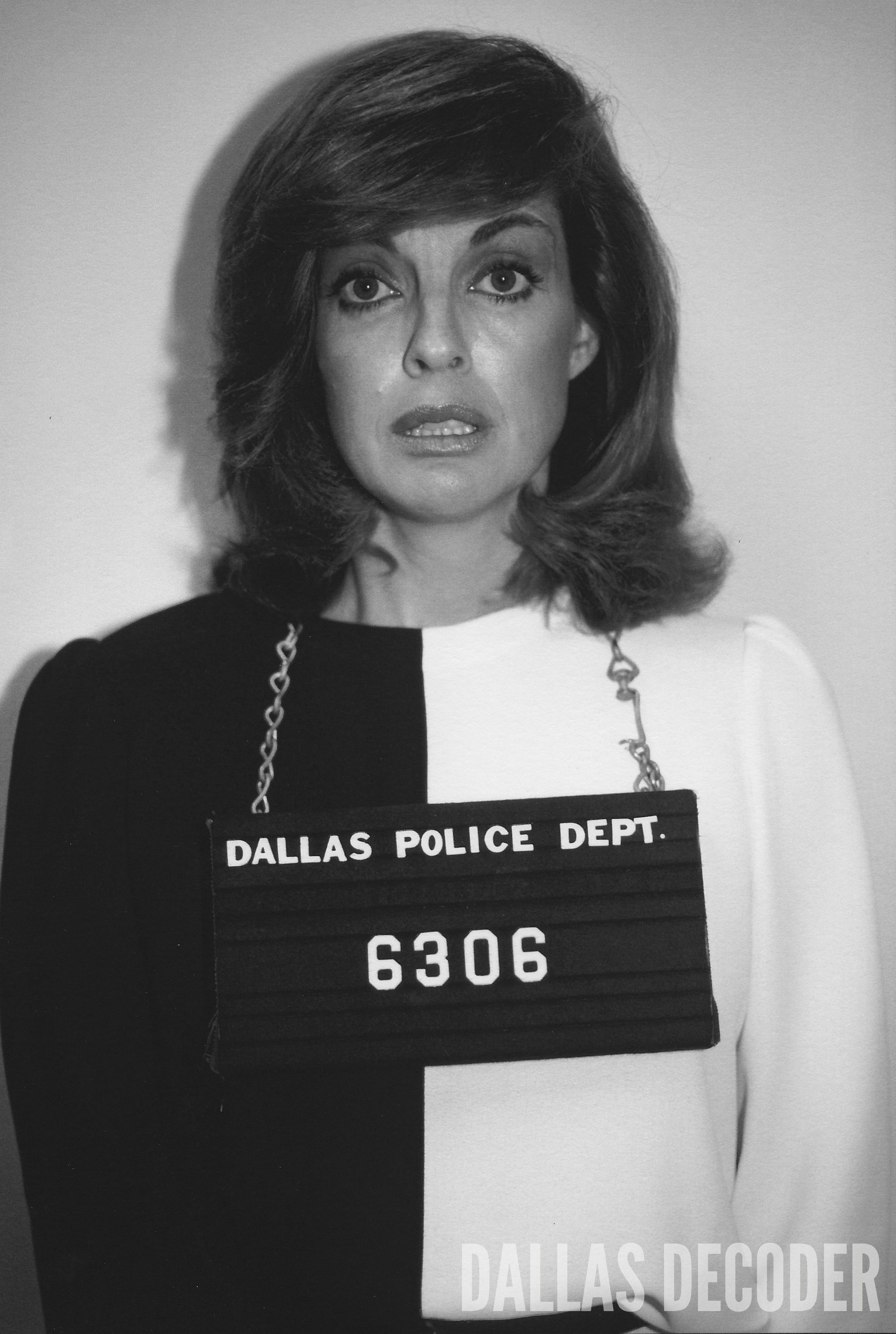 Sue Ellen (Linda Gray), after being arrested for J.R.’s shooting, has her mug shot taken in this 1980 publicity shot from “Who Done It?” a fourth-season “Dallas” episode.