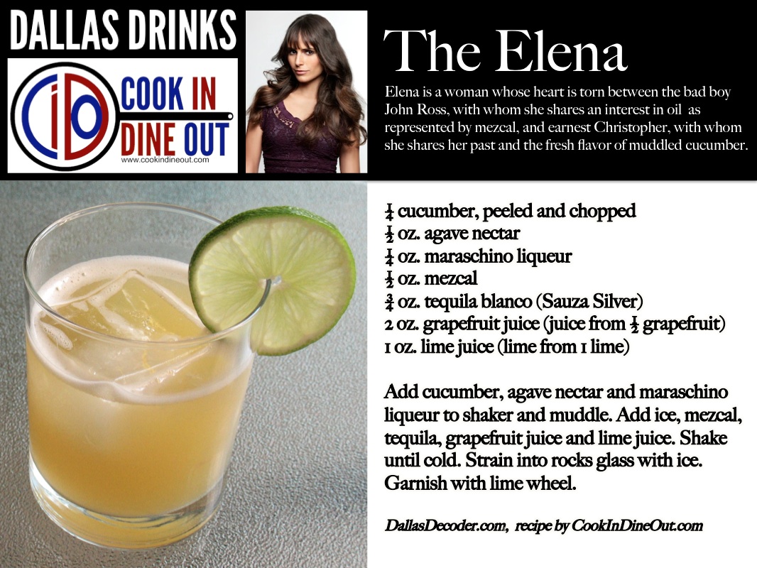 This summer, the “Dallas” fans at Dallas Decoder and Cook In/Dine Out are offering “Dallas Drinks,” a series of cocktails inspired by the characters from TNT’s new series. This week: The Elena. Like Jordana Brewster’s performance, this drink is mighty refreshing.