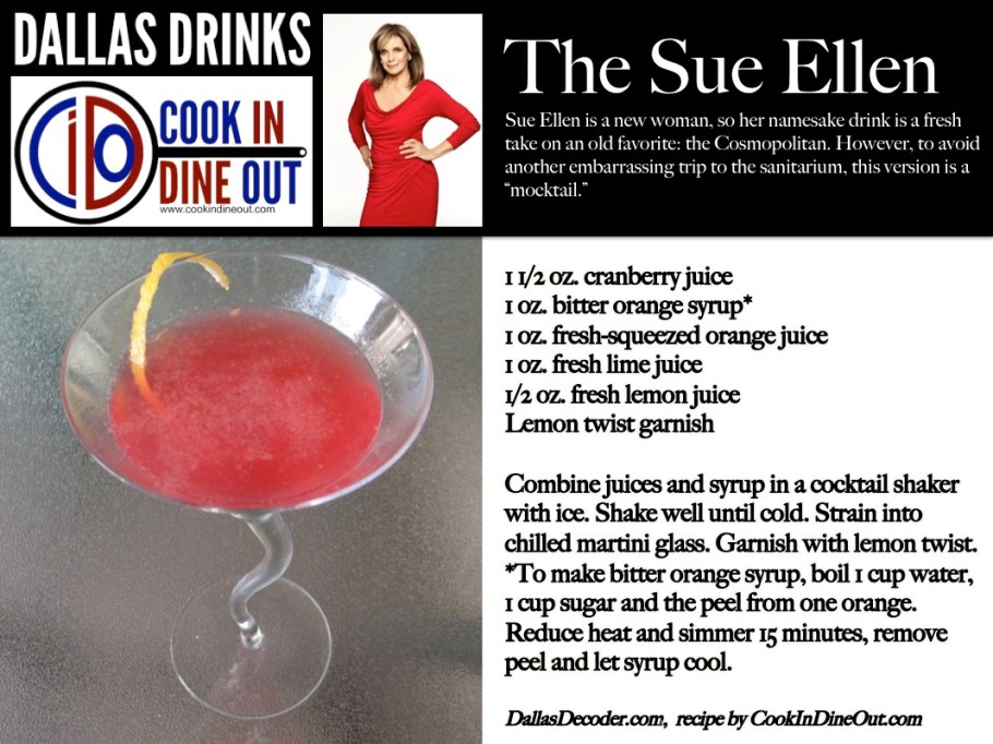 This summer, the “Dallas” fans at Dallas Decoder and Cook In/Dine Out are offering “Dallas Drinks,” a series of cocktails inspired by the characters from TNT’s new series. This week: The Sue Ellen, a “mocktail” as elegant as Linda Gray’s beloved alter ego.