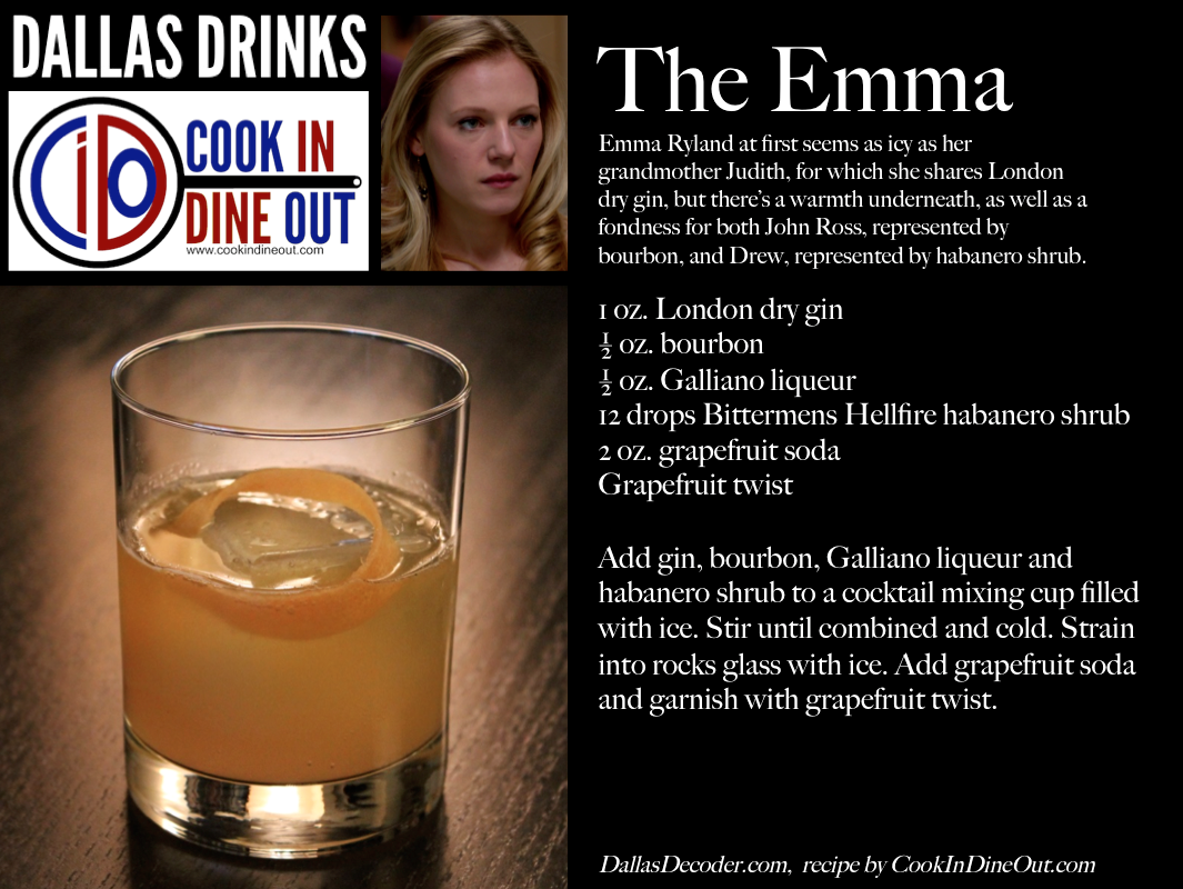 To honor Emma Bell’s performance on TNT’s “Dallas,” Dallas Decoder and Cook In/Dine Out offer an Emma Ryland-inspired “Dallas Drinks” cocktail.