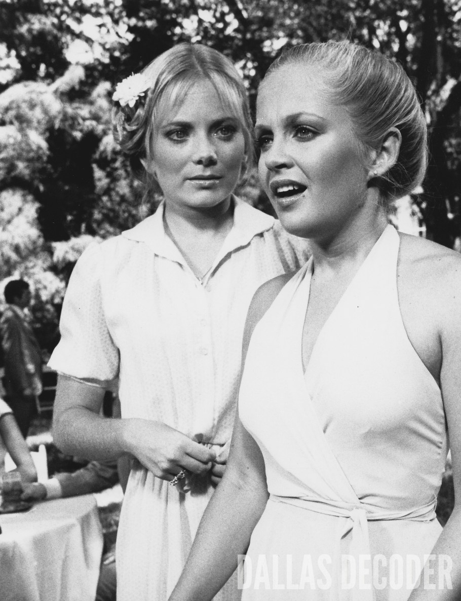 Bev and Lucy (Tami Barber, Charlene Tilton) attend a garden party in this 1981 publicity shot from “The Big Shut Down,” a fifth-season “Dallas” episode.