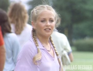 In the 1979 episode “Secrets,” Valene goes to Lucy’s college campus and approaches her daughter, one year after J.R. forced Val to flee Southfork without saying goodbye. At the time, J.R. lied and told Lucy that Val took off after demanding money from him, so when Lucy sees her mother again in “Secrets,” she treats her coldly and walks away. Val doesn’t give up and tries to speak to Lucy again later that day, explaining that J.R.’s extortion claim was untrue. Lucy doesn’t want to hear it. “Don’t bother, lady,” she says.