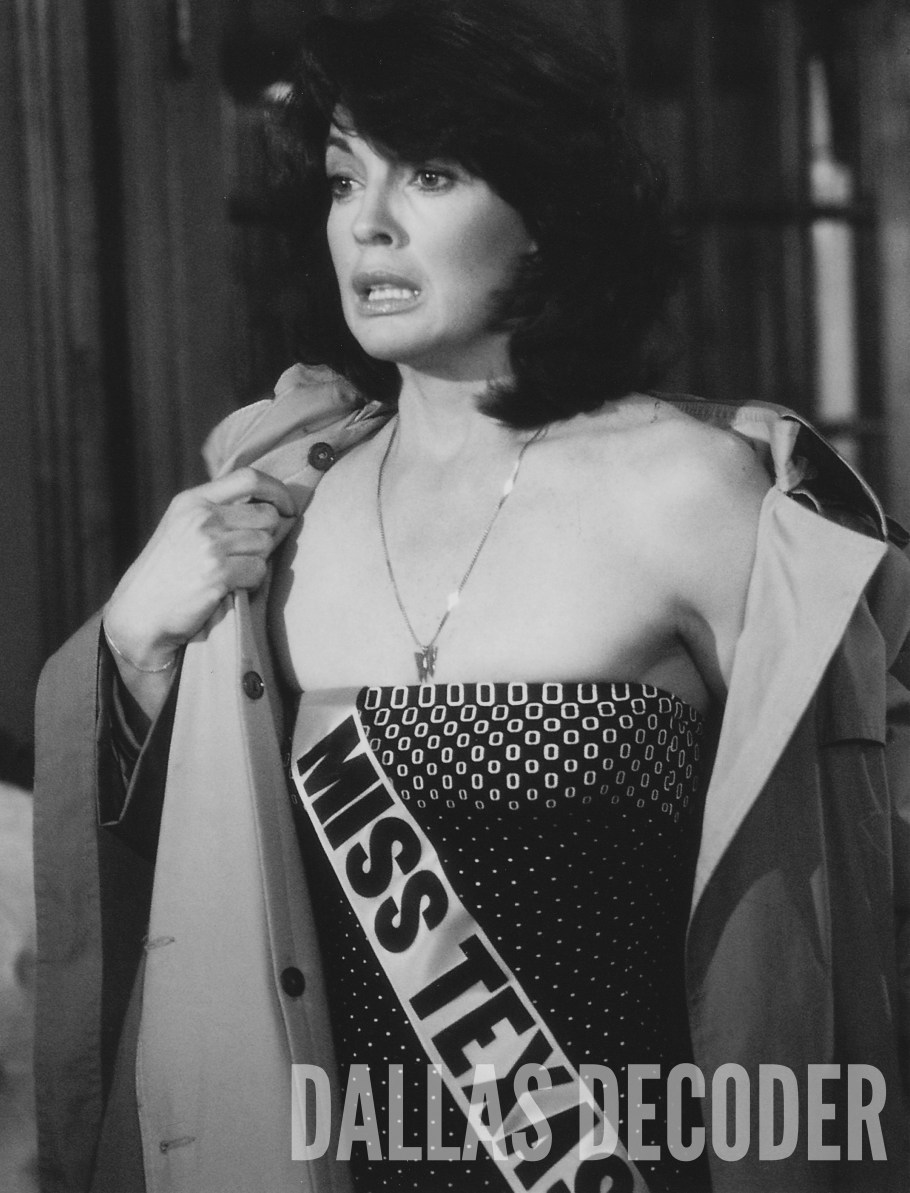 Cast: Mary Armstrong (Louise), Christopher Atkins (Peter Richards), Barbara Bel Geddes (Miss Ellie Ewing), Morgan Brittany (Katherine Wentworth), James L. Brown (Detective Harry McSween), Roseanna Christiansen (Teresa), Patrick Duffy (Bobby Ewing), Eric Farlow (Christopher Ewing), Linda Gray (Sue Ellen Ewing), Larry Hagman (J.R. Ewing), Susan Howard (Donna Krebbs), Steve Kanaly (Ray Krebbs), Howard Keel (Clayton Farlow), Ken Kercheval (Cliff Barnes), Audrey Landers (Afton Cooper), Bill Morey (Leo Wakefield), Charles Parks (Fred Robbins), Edmund Penney (doctor), Priscilla Beaulieu Presley (Jenna Wade), Victoria Principal (Pam Ewing), Debbie Rennard (Sly), Sherril Lynn Rettino (Jackie Dugan), Alexis Smith (Lady Jessica Montfort), Don Starr (Jordan Lee), Charlene Tilton (Lucy Ewing), D.J. Zacker (Louis)